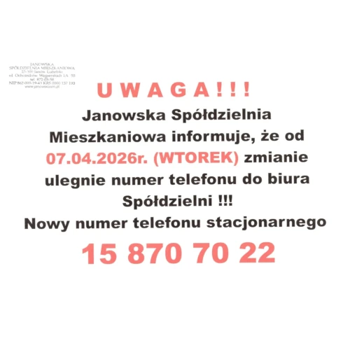 UWAGA!!! Janowska Spółdzielnia Mieszkaniowa informuje, że od 07.04.2026r. (WTOREK) zmianie ulegnie numer telefonu do biura Spółdzielni !!! Nowy numer telefonu stacjonarnego 15 870 70...